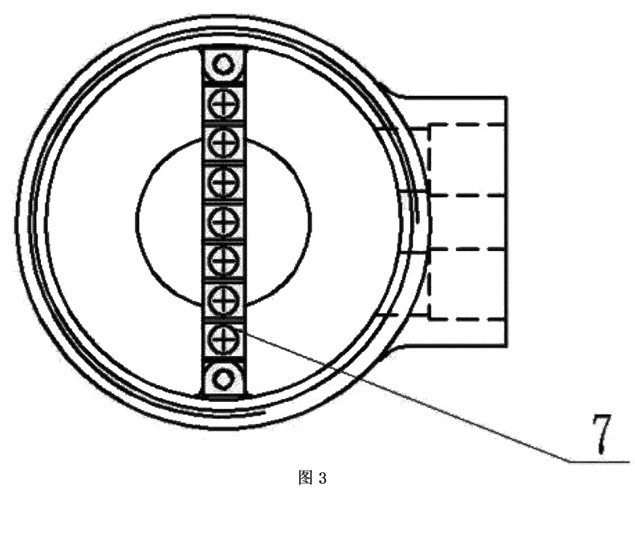 本實施例如圖4所示,分體接線盒用4只M6的螺釘8將売體3與固定在流量傳感器7上端,殼體3與傳感器7之間采用橡膠密封墊9密封。端子排7用兩個M4的螺釘固定在売體內(nèi),接線端子通過連接電纜5,穿過安裝在殼體上的格蘭頭6連接到變送器。分體蓋1通過螺紋擰緊在殼體3的上端,分體蓋1與売體3的密封采用0型圏密封。使用時電纜5與管道軸線方向一致,管道為垂直方向時,電纜出線方向朝下,從而不會造成外部的液體流入殼內(nèi)。