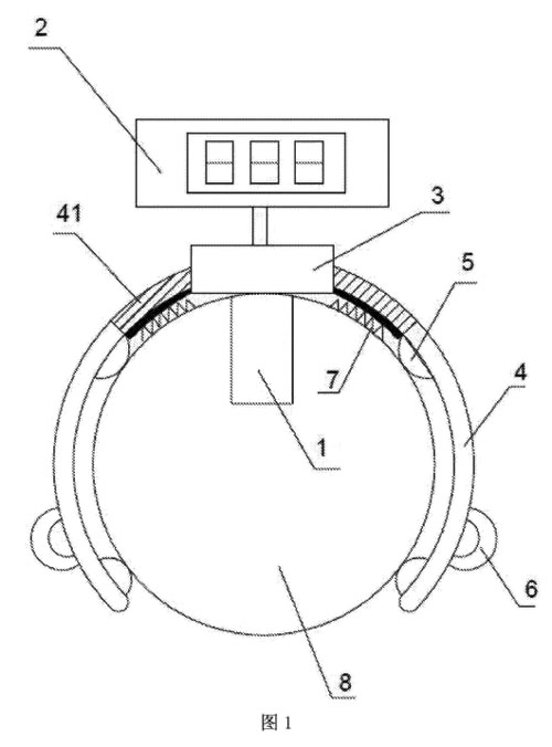 其中:1、電磁流量計本體,2、電磁流量計轉換器,3、鏈接基座,4、卡爪,5、凸點,6、把手,7、限位彈簧,8、流體管,41、彈性層