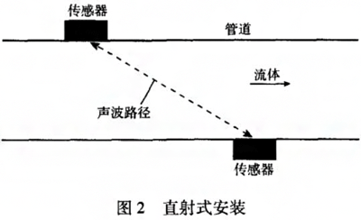 直射式安裝時(shí),一組換能器安裝在管道的對(duì)側(cè),這種安裝方式超聲波聲束的聲程zui短,可以提高信號(hào)強(qiáng)度,當(dāng)管道和液體的聲導(dǎo)性能差時(shí),要考慮使用直射式安裝。如圖2所示。