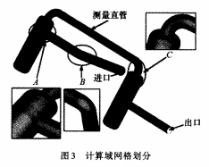 對連續(xù)性方程和動量方程在貼體坐標(biāo)下采用有限體積法在空間上進(jìn)行離散??刂品匠屉x散時(shí),壓力項(xiàng)采用二階中心差分格式,對流項(xiàng)采用二階迎風(fēng)差分格式,壓力速度耦合采用SIMPLEC算法。計(jì)算域形狀規(guī)則,采用六面體結(jié)構(gòu)化網(wǎng)格進(jìn)行離散。為了劃分結(jié)構(gòu)化網(wǎng)格,將計(jì)算域分成3個(gè)子域,分別創(chuàng)建塊、劃分網(wǎng)格。具體網(wǎng)格見圖3。