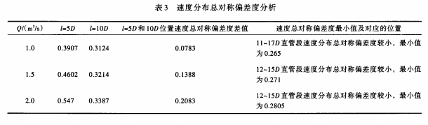 4.1.3 800mm內(nèi)徑電磁流量計(jì)測量管路設(shè)計(jì)分析 根據(jù)上述計(jì)算結(jié)果統(tǒng)計(jì)出不同過流量、不同直管長度,速度分布總對稱偏差度的*小值及對應(yīng)的位置,見表2。從表2可以看出,當(dāng)直管長度L取12m和14.4m時(shí),均有部分位置的速度分布總對稱偏差度較小,且兩種直管長度下總對稱偏差度*小值相差很小。以Q=2.0m3/s為例,L取12m和14.4m時(shí),總對稱偏差度*小值分別為0.3212和0.3198,差值為,0.0014。由此可見,當(dāng)測量直管長度達(dá)到一定值時(shí),繼續(xù)延長測量直管長度并不能顯著改善管內(nèi)速度的軸對稱分布情況。