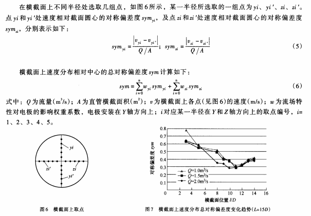 根據(jù)計(jì)算結(jié)果分析,盡管直管上并沒有速度完全中心軸對稱(速度總對稱偏差度為0)的用于安裝電磁流量計(jì)的理想位置,但是由于sym*小值較小,且延長直管長度后sym*小值變化很小,因此可以認(rèn)為,在設(shè)計(jì)800mm內(nèi)徑電磁流量計(jì)測量管路時(shí),直管長度取12m可滿足電磁流量計(jì)的安裝和測量要求,但考慮到電磁流量計(jì)本身的長度,直管長度應(yīng)在12m的基礎(chǔ)上適當(dāng)加長。