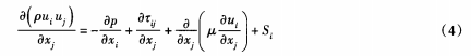 式中:p為流體密度;u為速度;P為壓力;r為雷諾應(yīng)力;x為空間坐標(biāo);μ為動力黏度;S為源項(xiàng),指標(biāo)i、j表示坐標(biāo)軸方向分量,遵從張量中的求和約定。