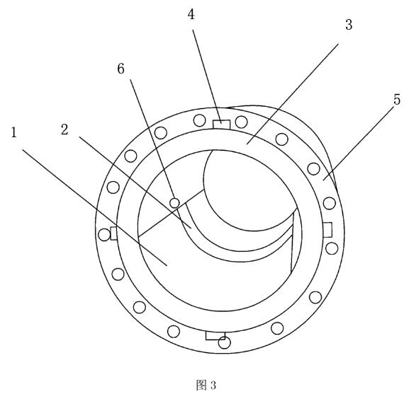 下面結(jié)合附圖和實(shí)施例對(duì)本實(shí)用新型做進(jìn)一步描述。雖然本實(shí)用新型將結(jié)合較佳實(shí)施例進(jìn)行描述,但應(yīng)知道,并不表示本實(shí)用新型限制在所述實(shí)施例中。相反,本實(shí)用新型將涵蓋可包含在有附后權(quán)利要求書(shū)限定的本實(shí)用新型的范圍內(nèi)的替換物、改進(jìn)型和等同物參見(jiàn)圖1至圖4所示,本電磁流量計(jì)耐磨裝置由相向的兩塊彎曲帶法蘭3的耐磨板1組成,耐磨板1為不銹鋼板,厚3mm,其外徑彎曲度和需配套的流量計(jì)管體5內(nèi)徑相符,和襯膠緊貼,耐磨板1彎曲后的弧度高須低于感應(yīng)電極6有5mm-10mm。,相連的法蘭3材質(zhì)也為不銹鋼,厚度無(wú)要求,直徑和需配套的流量計(jì)管體5一致,法蘭3用螺釘孔4固定在電磁流量計(jì)管體5的法蘭上。彎曲的耐磨板1和法蘭3用氬弧焊焊接在一起,在其中一塊彎曲的耐磨板1上再加焊一塊彎曲的搭板2,使污泥漿流經(jīng)耐磨板1時(shí)保證不發(fā)生停留和沉淀。本實(shí)用新型的耐磨板1不做成單一整體,做成左右兩半,主要是考慮這樣做工藝制作簡(jiǎn)單,容易和流量計(jì)襯膠緊貼不產(chǎn)生空隙,做成兩半拆裝也方便,由于不銹鋼不吸收磁場(chǎng)磁力線,法蘭3和流量計(jì)管體5法蘭連接相當(dāng)于接地,因此本實(shí)用新型的電磁流量計(jì)耐磨裝置既沒(méi)有減弱感應(yīng)電動(dòng)勢(shì)的輸出,也沒(méi)有形成新的干擾源,所以對(duì)電磁流量計(jì)的工作沒(méi)有影響該電磁流量計(jì)耐蘑裝置結(jié)構(gòu)簡(jiǎn)單,成本低廉,更換或增添方便,理論上材質(zhì)只要不是鐵都可以,但以不銹鋼*為合算。該電磁流量計(jì)耐磨裝置也可用于采礦作業(yè)和其他一切有液固兩相體的管道