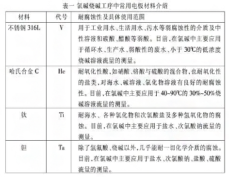 電磁流量計的測量電極是與工藝介質(zhì)直接接觸的**金屬材料,其作用是與導(dǎo)線連接將測量管中產(chǎn)生的微弱感應(yīng)電動勢傳輸?shù)睫D(zhuǎn)換器中的檢測單元。由于電磁流量計的電極部分處于工作磁場中,為防止磁力線在電極上集中,電極材料必須使用非導(dǎo)磁的金屬材料;并根據(jù)工況介質(zhì)對金屬材料的腐蝕速率(mm)a,即毎年被腐蝕掉的金屬厚度)來確定不同的工況介質(zhì)選擇不同的金屬材料。下面通過圖表一的方式介紹在氯堿燒堿工序中常用的幾種電極材料及其使用范圍。