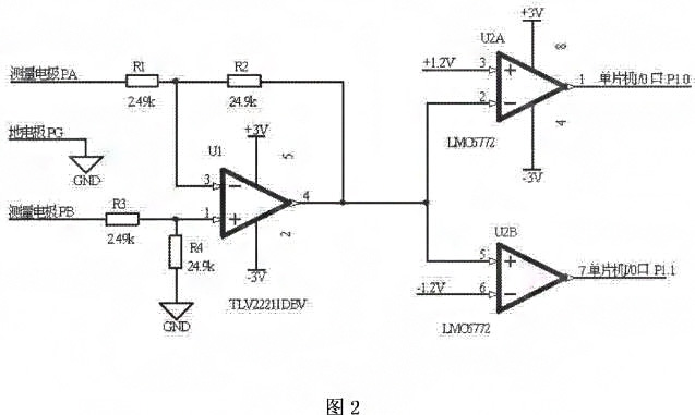 如圖2所示,測量電極PA與電阻R1的一端連接,電阻R1的另一端與電阻R2的端、運算放大器u的反相輸入端3腳連接,電阻R2的另一端與運算放大器U的輸出端4腳、雙路比較器通道一U2A的反相輸入端2腳、雙路比較器通道二U2B的同相輸入端5腳連接,測量電極PB與電阻R3的一端連接,電阻R3的另一端與電阻R4的一端、運算放大器U的同相輸入端1腳連接,電阻R4的另一端與地連接,地電極PG與地連接,運算放大器U1的電源供電端5腳與正電源+3V連接,運算放大器U1的接地端2腳與負(fù)電源-3V連接,雙路比較器通道一U2A的同相輸入端3腳與+1.2V連接,雙路比較器U2A的電源供電端8腳與正電源+3Ⅴ連接,雙路比較器υ2A的接地端4腳與負(fù)電源-3V連接,雙路比較器通道U2A的輸出端1腳與單片機(jī)的I/0口P1.0連接,雙路比較器通道二U2B的反相輸入端6腳與-1.ΣV連接,雙路比較器通道二U2B的輸出端7腳與單片機(jī)的I/0口P1.1連接工作原理:電阻R1與電阻R3相等,電阻R2與電阻R4相等,且電阻R1為10倍電阻R2;電阻R1、電阻R2、電阻R3、電阻R4、運算放大器U1組成了一個差分放大電路,放大倍數(shù)為10。當(dāng)測量電極PA電位等于測量電極PB電位時,雙路比較器通道一U2A的反相輸入端2腳和雙路比較器通道二U2B的同相輸入端5腳的電位為零,雙路比較器通道一U2A的輸出端輸岀高電平,雙路比較器通道二U2B的輸岀端輸岀高電平。當(dāng)測量電極PA電位高于測量電極PB電位120m時,雙路比較器通道一U2A的反相輸入端2腳和雙路比較器通道U2B的同向輸入端5腳的電位大于+1.2V,雙路比較器通道一U2A的輸出端輸出低電平,雙路比較器通道二U2B的輸出端輸出高電平。反之,當(dāng)測量電極PA電位低于測量電極PB電位12σmV,雙路比較器通道一U2A的反相輸入端2腳和雙路比較器通道二U2B的同相輸入端5腳的電位小于-1.2V,雙路比較器通道一U2A的輸岀端輸岀高電平,雙路比較器通道二U郾B的輸出端輸岀低電平。雙路比較器通道一U2A的輸岀端和雙路比較器通道二U2B的輸出端分別連接單片機(jī)的1/0口P1.0和P1.1,通過I/0口P1.0和P1.1的高低電平的檢測實現(xiàn)電磁流量計測量電極兩端是否存在極化電壓和極化電壓極性的檢測。