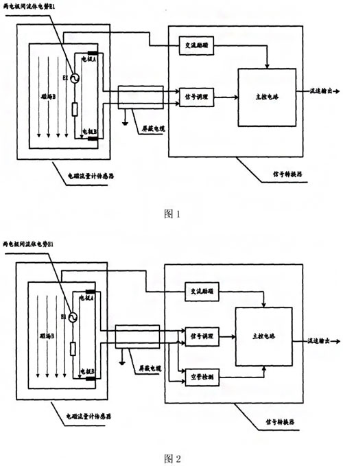圖1是一種原有電磁流量計的電路結(jié)構(gòu)示意圖圖2是一種原有帶空管檢測的電磁流量計的電路結(jié)構(gòu)示意圖圖3是一個電極與地之間施加空管檢測信號的電磁流量計的電路結(jié)構(gòu)示意圖圖4是兩個電極之間施加空管檢測信號的電磁流量計的電路結(jié)構(gòu)示意圖五、具體實施方式見圖1示意圖中,電磁流量計傳感器在交流勵磁下,產(chǎn)生交變磁場,導(dǎo)電流體在交變磁場中切割磁力線產(chǎn)生感應(yīng)電勢E1,通過屏蔽電纜輸出至遠端信號轉(zhuǎn)換器的主控制電路板,在主控制電路板上輸出流速信號并顯示見圖3、圖A示意圖中,由CPU控制口產(chǎn)生周期為16us的高頻激勵,經(jīng)模擬轉(zhuǎn)換為高頻正弦激勵E2,該i正弦激勵直接施加在,電磁流量計傳感器的其中一個電極與地或者是兩個電極之間,(圖3是一個電極與地之間施加空管檢測信號的電磁流量計的電路結(jié)構(gòu)圖,圖4是兩個電極之間施加空管檢測信號的電磁流量計的電路結(jié)構(gòu)圖):由此產(chǎn)生被測流體內(nèi)阻R1的測量信號U1,該測量信號U1與流體內(nèi)阻R1成線性關(guān)系U1=K*R1(K為已知系數(shù)),不可避免的是流體內(nèi)阻測量信號與流體流速測量信號同時存在,二者混在一起,再經(jīng)過高通濾波電路將空管檢測信號提取出來,此時對流速信號衰減在604B以上,經(jīng)CP實時采樣并經(jīng)過數(shù)字濾波后,與設(shè)定的閱值(可調(diào)參數(shù))相比較,若判斷為空管,則v發(fā)出zcro信號,立刻閉合開關(guān)K1關(guān)閉流速測量信號,使信號轉(zhuǎn)換器顯示為零,否則斷開開關(guān)K正常輸出流速信號。而電極上流速測量信號經(jīng)過低通濾波電路,此時對空管檢測信號衰減60u8以上,再經(jīng)過信號調(diào)理電路后輸出流速信號,實現(xiàn)與空管檢測信號相互分離,從而保證流速測量的準(zhǔn)確度008]見圖2示意圖中,是一種原有的帶空管檢測的電磁流量計的電路結(jié)構(gòu)圖,由于電纜分布電容的影響,該分布電容對高頻率的空管檢測信號有一定的損耗,特別是長距離的屏蔽電纜,會直接影響到空管檢測信號對于流體電導(dǎo)率的測試,所以該結(jié)構(gòu)并不適合,本實用新型提出的高頻率信號空管檢測方式。結(jié)合圖3和圖4可以看出為了保證微弱的空管檢測信號不失真的傳輸,空管檢測裝置就近放置于傳感器出線處(傳感器內(nèi)部),進行信號處理后再通過屏蔽電纜傳輸,從而解決了高頻率空管檢測信號對電纜分布電容大小的要求009由于電磁流量計傳感器與信號傳換器之間通常只有用于傳輸流速信號的二芯屏數(shù)電纜,并沒有低壓直流電源供給電纜,為了滿足通用的安裝習(xí)慣,不對空管檢測裝置另外增加供電電纜,空管檢測裝置的供電電源使用二芯屏蔽電纜的其中一根導(dǎo)線進行供電,另外一根導(dǎo)線用于傳輸經(jīng)過調(diào)理后的流速信號;實現(xiàn)直流供電與信號傳輸共用一根二芯屏蔽電纜0020根據(jù)不同的使用環(huán)境,信號傳換器需要調(diào)整空管檢測裝置的空管閱值參數(shù)設(shè)置時,則使用數(shù)字信號調(diào)制方式,該信號疊加在供電電源的電纜上進行傳輸,方便在現(xiàn)場調(diào)整空管檢測裝置的參數(shù),滿足不同的使用條件。由于數(shù)字編解碼是已知的技術(shù),所以在這里不詳細(xì)進行說明