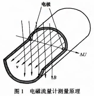 電磁流量計測量原理如圖1所示,管道內(nèi)流動的導電液體切割磁力線,將在兩端電極間產(chǎn)生電勢差ΔU,ΔU與磁通量密度B、液體流速ν符合弗來明右手定則。只要管道內(nèi)部流場理想、磁場穩(wěn)定,△U的大小與管道內(nèi)介質(zhì)平均流速成嚴格的線性關(guān)系,從而通過測量ΔU的大小可確定管道內(nèi)介質(zhì)流量。
