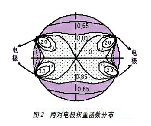 傳統(tǒng)點電極電磁流量計的權(quán)重函數(shù)分布如圖1所示,所繪等權(quán)重函數(shù)線近電極W=2,遠離電極w=0.65。