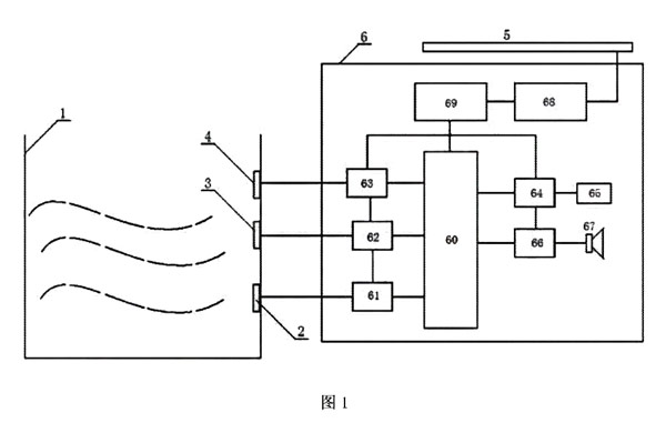 參照圖1,一種鉆井泥漿儲罐液位報警裝置,包括泥漿儲罐1、傳感器2-4、報警器6和太陽能電池5,所述泥漿儲罐1一側(cè)的內(nèi)壁上,自下而上順次設(shè)有第 一傳感器2、第 二傳感器3和第 三傳感器4,所述報警器6包括蓄電池68、穩(wěn)壓電路69、中央處理器60、第 一轉(zhuǎn)換電路61、第 二轉(zhuǎn)換電路62、第 三轉(zhuǎn)換電路63、隔離電路64、網(wǎng)絡(luò)接口65、放大電路66和喇叭67;所述第 一傳感器2通過第 一轉(zhuǎn)換電路61與中央處理器60的第 一輸入端相連接,第傳感器3通過第 二轉(zhuǎn)換電路62與中央處理器60的第 二輸入端相連接,第 三傳感器4通過第 三轉(zhuǎn)換電路63與中央處理器60的第 三輸入端相連接,中央處理器60的一輸出端通過隔離電路64與網(wǎng)絡(luò)接口65相連接,中央處理器60的另一輸出端通過放大電路66與喇叭67相連接,所述太陽能電池5與蓄電池68相連接,蓄電池68通過穩(wěn)壓電路69與中央處理器60、第 一轉(zhuǎn)換電路61、第 二轉(zhuǎn)換電路62、第 三轉(zhuǎn)換電路63、隔離電路64及放大電路65相連接。其中,所述第 一傳感器2、第 二傳感器3及第 三傳感器4均為壓電陶瓷片。所述中央處理器60為單片機電路或可編程控制器。