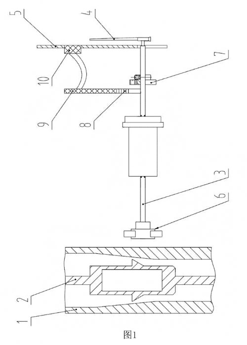 參見圖1、圖2,一種金屬轉子流量計的組合結構,包括測量系統和位移傳感裝置,測量系統包括錐管1和位于錐管1中的磁性浮子2,位移傳感裝置包括指針組件、刻度盤5和轉換器,其中,指針組件包括轉動軸3、感應磁鋼6和指針4,感應磁鋼6固定在轉動軸3的一端,該感應磁鋼6靠近所述磁性浮子2,且感應磁鋼6的磁場方向與磁性浮子2的磁場方向相反,指針4固定在轉動軸3的另一端,其中,磁性浮子2的上端為N極,磁性浮子2的下端為S極,感應磁鋼6的上端為S極,感應磁鋼6的下端為N極。轉換器包括角位移磁鋼7、線性角位移傳感器8、集成電路板9和液晶顯示器10,液晶顯示器10固定安裝在刻度盤5上,角位移磁鋼7呈圓環(huán)狀,角位移磁鋼7固定在轉動軸3上,線性角位移傳感器8固定在集成電路板9上,線性角位移傳感器8靠近角位移磁鋼7,集成電路板9與液晶顯示器10之間通過數據線連接。